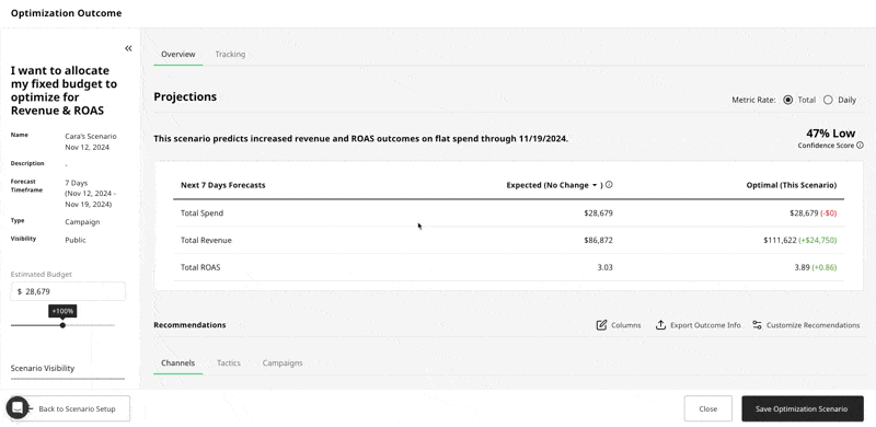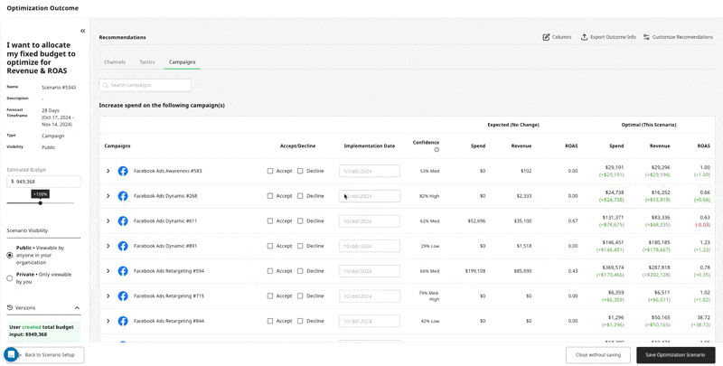 Create a Scenario: Select any combination of Channels or Campaigns, give the Optimizer a fixed budget on which to optimize the allocation for max Revenue and ROAS. The scenario outcome screen will appear with both channel level and campaign level recommendations, and you'll notice two new columns have been added to the results: Accept/Reject reasoning: