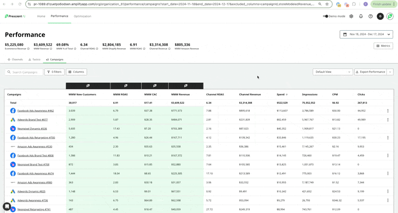 On the Performance Page, when you select Halo View from the views dropdown, this saved view will now automatically populate the Halo Effects columns split out by Amazon & Shopify.
