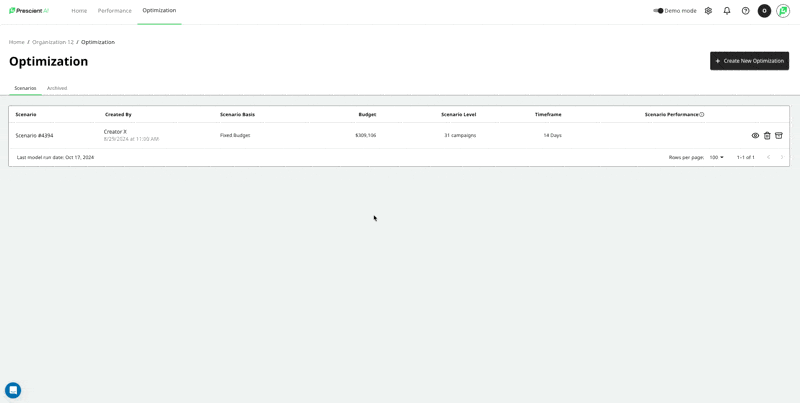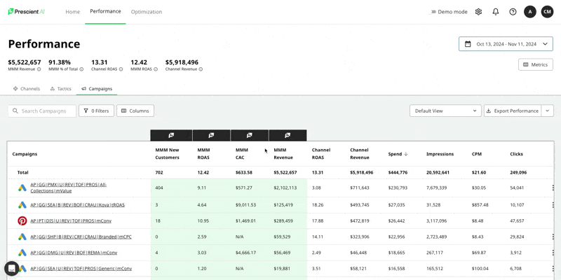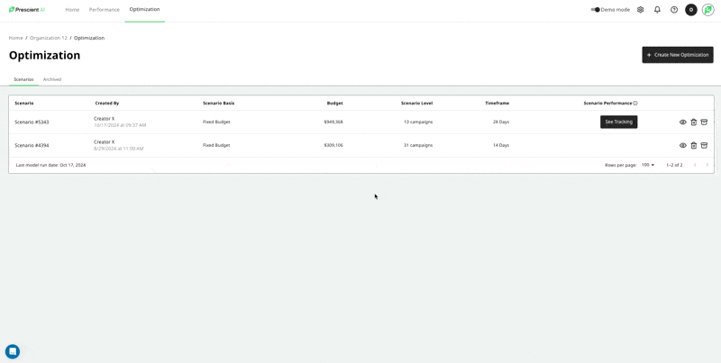 Track the Impact: Once users have reviewed, accepted, and implemented the recommendations, now we know that they want to track the impact of that change! For this part of the workflow, we have added a new tab in the optimization outcome screen called Tracking. This screen will compile only the campaigns that have both been accepted & have an implementation date. We will track the original optimization recommendation to the actual MMM revenue both in-flight and for the total scenario timeframe. In this example below, I have accepted 1 campaign to start tracking today, and one campaign to start tracking on 10/19. Tomorrow, you'll start seeing the MMM Revenue tied to this spend change and track how our forecast stacks up against what really happens.