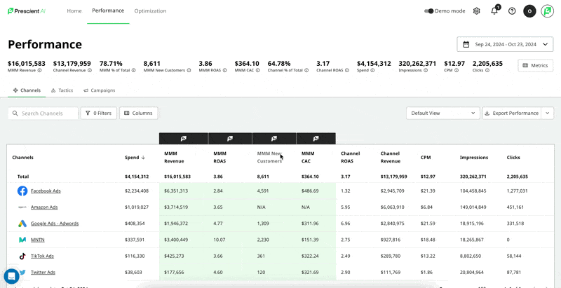 In addition to having MMM % of Total on the Performance Page, we have included it on the KPI card on homepage as a time series chart. Users can plot any date range, compare date ranges, and see the split between Amazon and Shopify as a percent of total ecommerce revenue (if applicable).