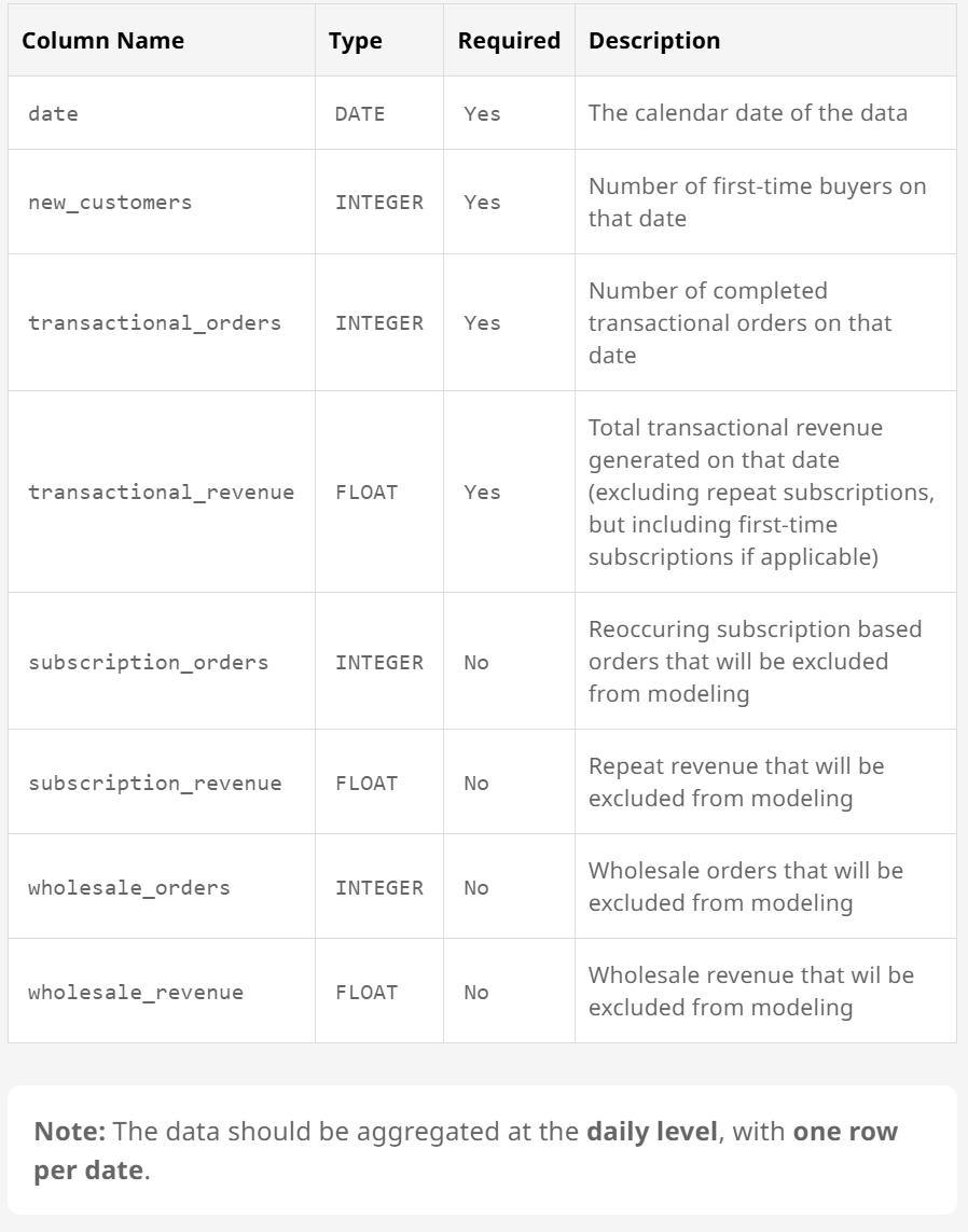 Our integration expects access to a single table that aggregates your key daily ecommerce metrics. This table should follow the schema below: