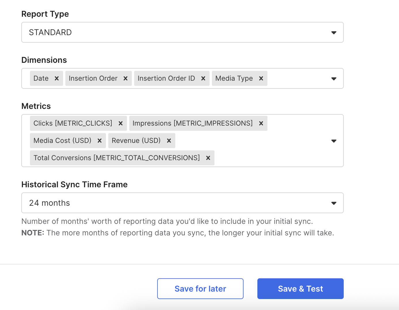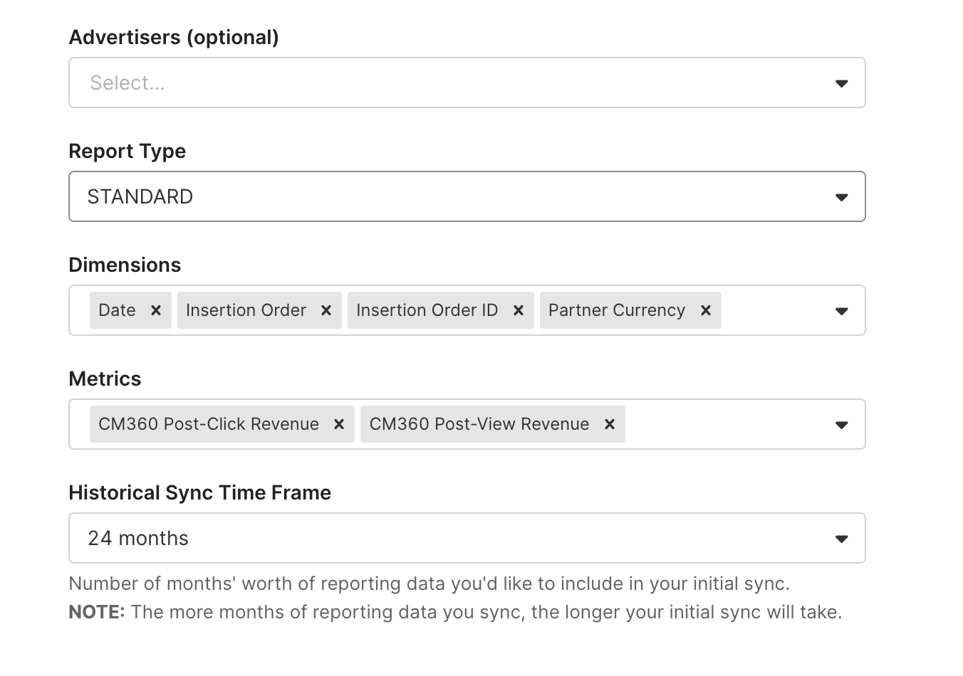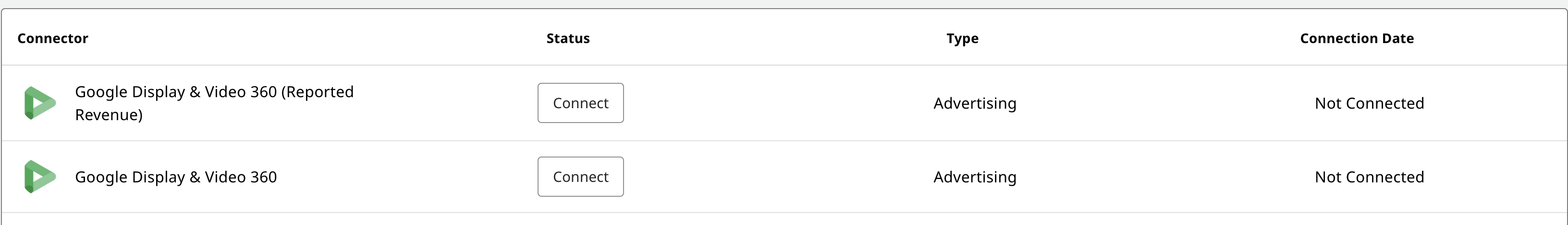 NoteEven though you are connecting multiple connectors, our dashboard will only report for Google Display & Video 360.